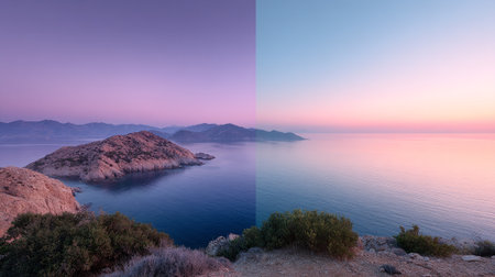 Serene Coastal View at Sunset with Contrasting Tones and Tranquil Waters