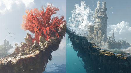 A stunning surreal landscape featuring a cracked earth transition into water, showcasing a vibrant urban cityscape and serene natural elements, illustrating environmental themes.