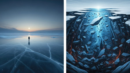 The image captures a person standing on a vast, cracked ice surface under a soft sunrise. The composition focuses on the figure's small stature relative to the expansive environment. The second image depicts an abstract view of a deep ice crack, featuring dark colors. Suitable for illustrating travel or environmental themes.