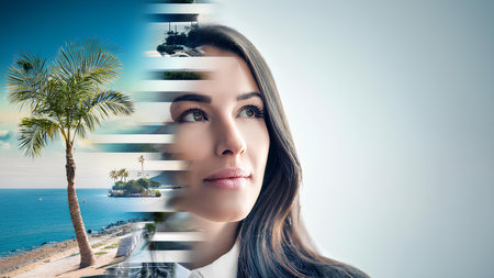 Her dreamy expression conveys a sense of adventure. Collage of a businesswoman against a modern seaside resort with turquoise waters and palm trees on a monochrome background.