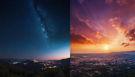 Generative AI : Different times of day dawn and sunset day and night Concept of continuous flow of time and unity and struggle of opposites Elements of this image furnished by NASA