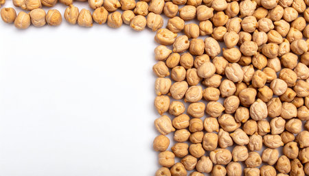 A pile of dried chickpeas is arranged on the right side of a white surface, leaving ample copy space on the left.
