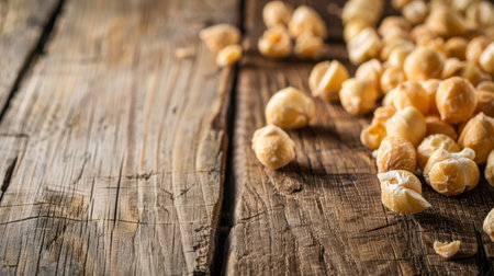 Dry chickpeas scattered on a brown wooden background. Top view. Copy, empty space for text.