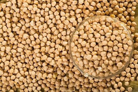 Close up on a dry raw chickpeas in a box. Macro. Healthy dietary food rich in microelements cellulose. Food for vegeterian and people who cares about his health. Organin food.