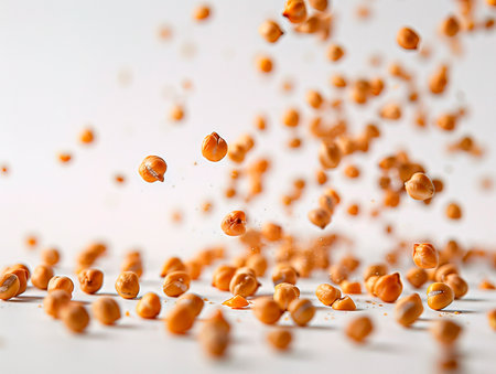 Chickpeas is flying in the air. Chickpeas and white plate isolated on white background. Creative concept cooking food. photography of CHICKPEAS falling from the sky, hyperpop color scheme. glossy