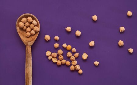 A portion of dried chickpeas in a wooden spoon on a blue table with green leaves. Concept of proper balanced nutrition and healthy vegetarian food.