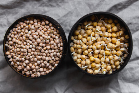 Sprouted and dry chickpea in wooden bowls on rustic linen textile. Bean sprouts raw. Source of protein for vegan healthy diet