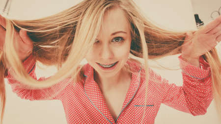 Fashionable trendy sleepwear concept. Portrait of attractive young woman wearing cute pink pajamas playing with her long blonde hair.