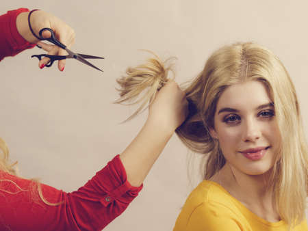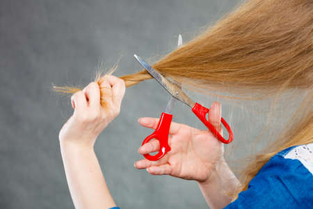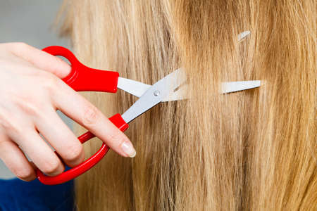 Cutting coiffure and new look. Part body blonde woman cut her long straight hair. Female hands with red scissors making modern hairstyle.