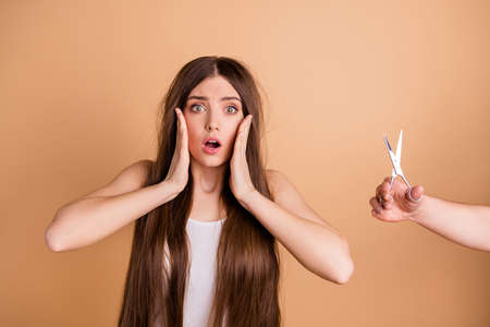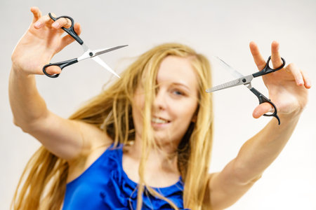 Craziness of professional hairdresser. Hair hygiene. Girl with scissors making crazy funny face preparing herself to cutting styling new image hairdo coiffure.