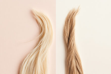 Detailed view shows a broken hair strand, revealing texture and fragility against a smooth beige backdrop in soft lighting.
