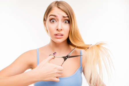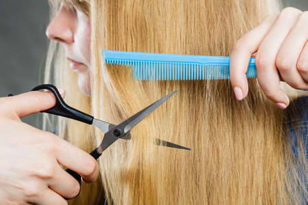 Little look change concept. Young blonde woman cutting down shearing her fringe short front hair. Girl using big scissors.
