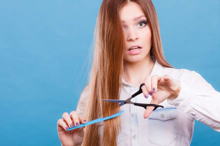 Redhaired woman cutting her damaged dry hair with scissors isolated over blue background. Hair Repair Treatment Cure