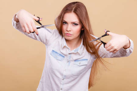 Woman with scissors having hair cut. Close up of a young woman with beautiful hair hold scissors, yellow background.