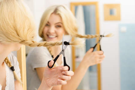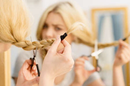 Woman deciding to cut her long blonde hair tied in braid. Hairstyle change at home.