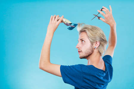 Hairdo changing hairstyle concept. Cool male hairstylist making self trendy haircut, fashion blonde metrosexual model going to shave his long hair, using shaver and scissors