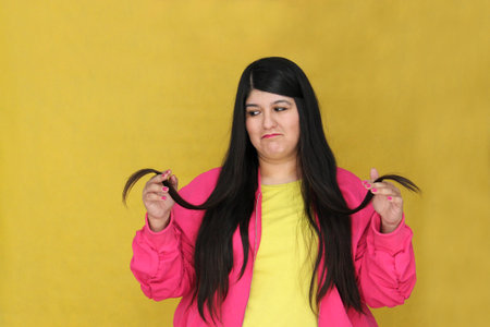 A 30-year-old Latina woman with long, straight hair is dissatisfied and frustrated with her dry, damaged hair and split ends