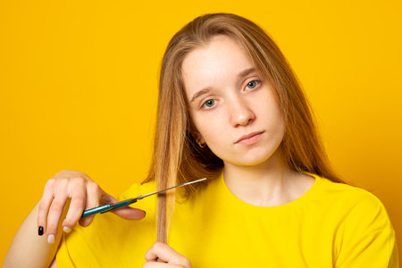 Portrait of sad and unhappy teen girl cutting her hair with scissors while standing over yellow background. Young student experiments with her hairstyle at home.