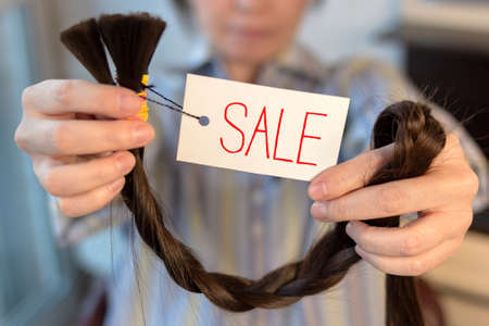 Long brown cut braid with tag in female hands, sale of woman cut hair, depth of field, front selective focus
