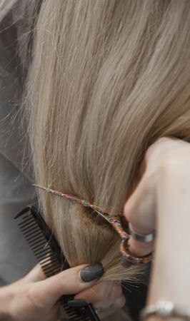 Professional and perfect image change. Close up of red big scissors cutting blonde straight long smoothy hair. Woman in barber salon.