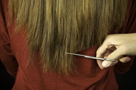 Close up of hairdresser hands cutting brown hair at home. Professional stylist trimming hair split ends.