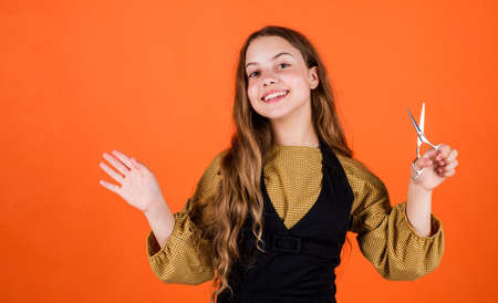 child with scissors wants to cut hair. girl in hairdressing salon. teenager cutting hair. Cute girl cutting hair to herself with scissors. kid is trimmed in the hairdressers. Form follows you