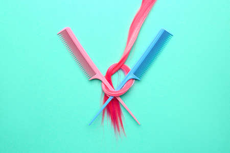 Curly strand of dark hair tied with an elastic band and black comb setting on bright yellow background. Studio, isolated, copy space.