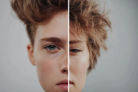 The image depicts two halves of womens faces merged together, showcasing a unique split visual, A face that is split down the middle, showing two different expressions