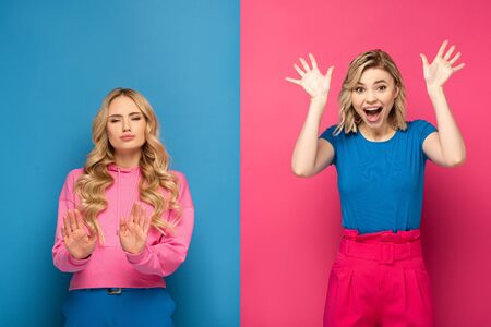 Blonde woman showing stop sign near excited sister on pink and blue background