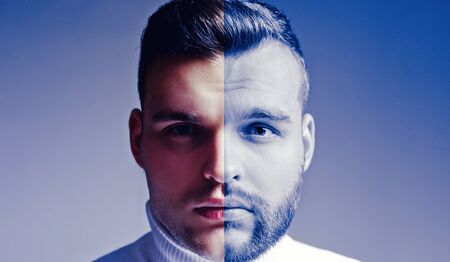 Scared and cheerful. Fun and creative combination of portraits of young guy with different emotions, various facial expression on splited studio background. Bipolar personality. Copyspace for ad.
