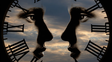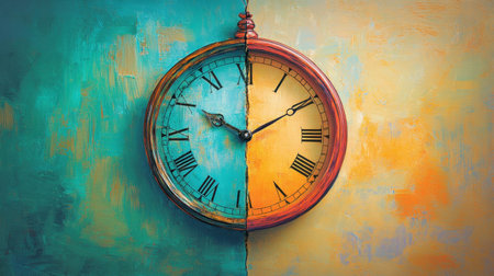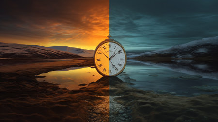 Clock against contrasting blue and orange sky represents time duality