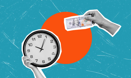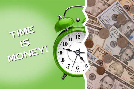 Clock face showing time is money surrounded by coins on colorful background