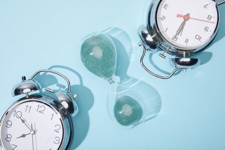 Alarm clock with exploding blue and orange powder, abstract photography. Concept of time and creativity.