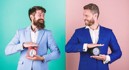 A person in a suit holds two contrasting alarm clocks, symbolizing time management or time zones.