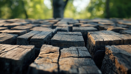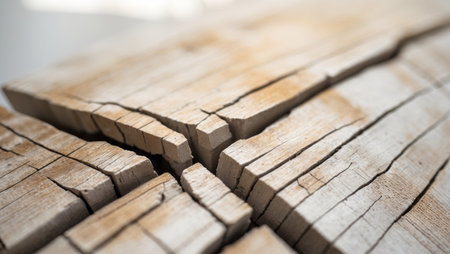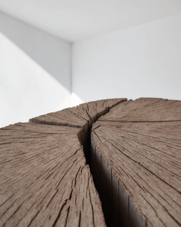 Explore the intricate details of a textured wooden surface showcasing natural cracks and unique grain patterns, illuminated by soft, warm lighting. Perfect for rustic themes.
