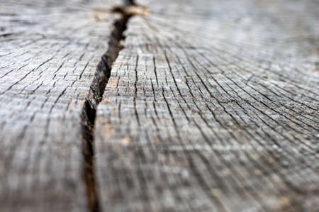 Old grey brown wood cut texture. Grunge dark background closeup. Detailed texture of a cracked section of a tree.