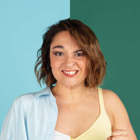 Two different halves of young female face isolated over colored backgrounds. Angry, displeased.