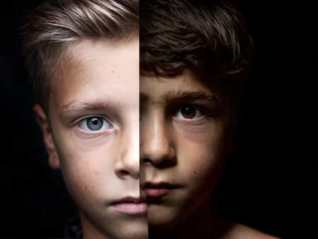 Two halves of young female faces over colored backgrounds. Tense, stressful.