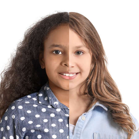 Comparison portrait of African-American and Caucasian girls on white background. Stop racism