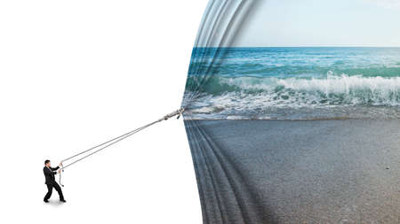 businessman pulling open sea sandy beach curtain covered blank behind isolated on white background