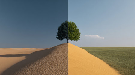 A solitary tree stands atop a sand dune, split between a desert and a green field under contrasting skies. The image displays a balanced composition. It highlights a blend of nature's elements, featuring sunlight and open space. Suitable for various uses, this could be utilized in editorial or design projects.