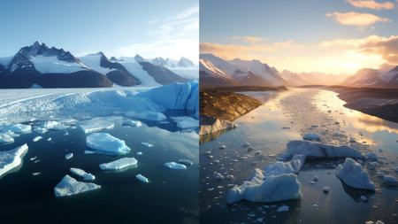 A composite image shows a stark before-and-after comparison of a glacier, once expansive and now greatly diminished. The visual shift from a solid icy landscape to a warmer, watery environment underscores climate change impacts