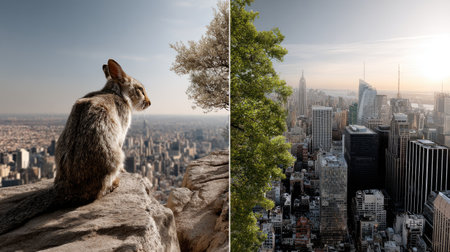 A captivating scene featuring a rabbit perched on a cliff overlooking a majestic urban skyline. This image captures the harmony between wildlife and city life, showcasing tranquil moments against a dynamic backdrop.