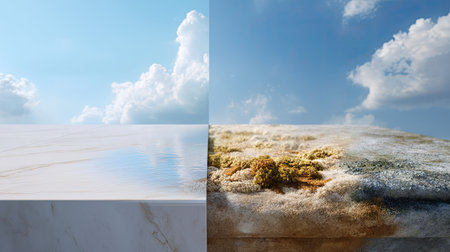 Visualizes the stark contrast between clean air and polluted air conditions in an urban landscape, highlighting the impact on city skylines and visibility.