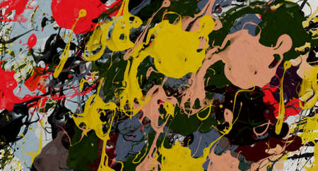 splashed of spilled yellow green red black paint. expressionism
