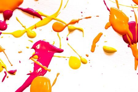 Colorful paint splashes on white paper background. Top view.