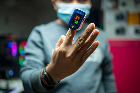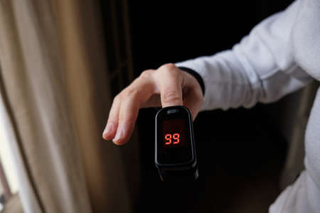 Man using pulse oximeter to measure oxygen saturation in covid19 pandemic disease,medical home monitoring treatment