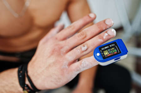 Close up pulse oximeter in finger in fitness men with naked torso.