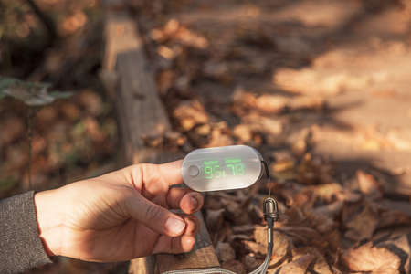 Blood oxygen meter on woman finger. Sunny autumn day.