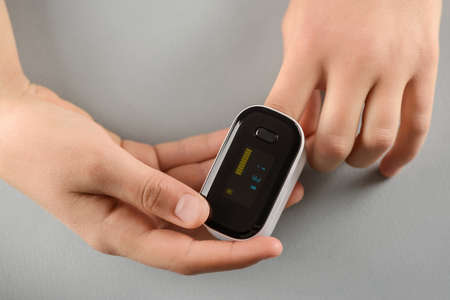 young man hand using pulse oximeter
